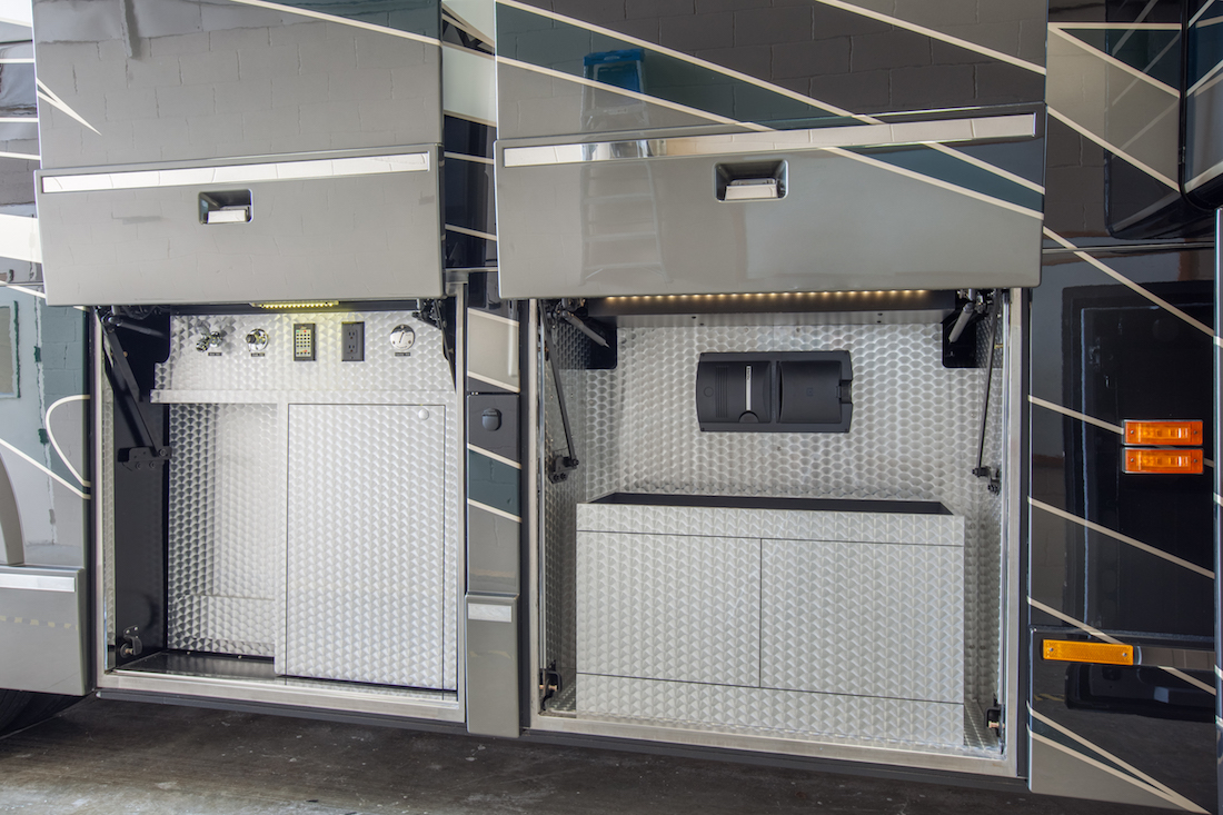 High gloss gray obeche wood veneered cabinets, beautiful quartz countertops, combined with rich earth toned wood and leather wall treatments make this coach strikingly glamorous, yet approachably inviting and livable.